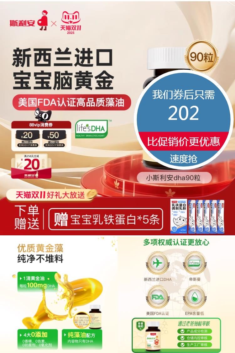 【88VIP+消费券+淘金币+回购礼金!送乳铁蛋白*5】藻油90粒,美国FDA认证!优质海藻油提取,含量高更纯净,易吸收!促进大脑发育,让孩子更聪明,无人工色素香精添加,适合孕妇和孩子的藻油!