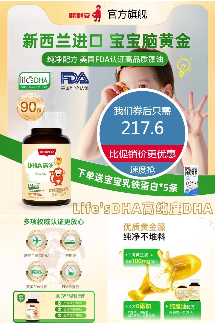 【首单+88VIP+淘金币更优惠!送乳铁蛋白5袋*1】藻油90粒,美国FDA认证!优质海藻油提取,含量高更纯净,易吸收!促进大脑发育,让孩子更聪明,无人工色素香精添加,适合孕妇和孩子的藻油!