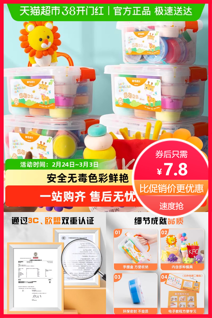 【红包到手5.8,12色*2袋装加赠4包白色+全套工具】4D超轻粘土,安全的,更放心,可叠色,色彩鲜艳,亲肤不粘手,易拉伸,可塑性强,反复使用不掉色,单色小袋独立包装,方便使用!