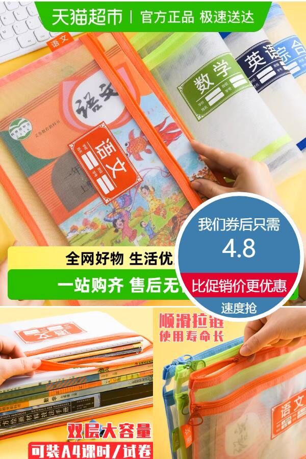 大容量科目分类文件袋,双层大容量,可装A4课时/试卷,以及文件证书资料等,网格拉链式,结实久用,环保无异味!