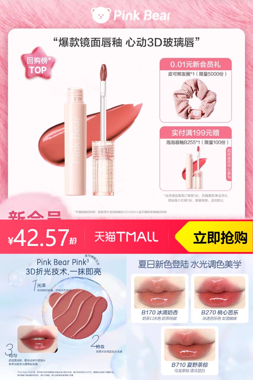 【拍3件,117-50劵-17.7立减-2淘金币-消费劵=42.57,均价一只14】嫩到冒泡泡啦!!!水光唇釉还得看pinkbea皮可熊啊!! 太欲太嗲了!!刷新可爱新高度