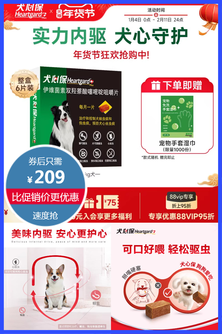 送宠物手套湿巾限量1000份!立减40元,消费劵25元叠加劵到手184元!犬心保中型狗体内驱虫口服药6粒,专研体内高危虫,针对性预防致死性心丝虫,驱杀5种高发肠道寄生虫,真牛肉制作,适口性好,狗狗爱吃,解决喂药难题