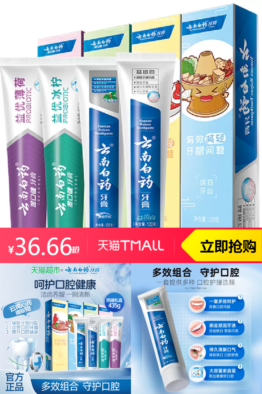 【原价格-立减11元-5元劵-88立减2.4-超市补贴5.9-淘金币0.69-淘礼金2.15-超补补贴6元红包(下拉详情超级补贴领取)=36.66!还送牙刷1支(限量,下单时候注意看赠品有无,没有就是送完了)】云南白药牙膏益生菌清新口气护龈亮白家庭装,清新口气+亮白牙齿+强韧牙龈~守护全家好口腔,品质保证!