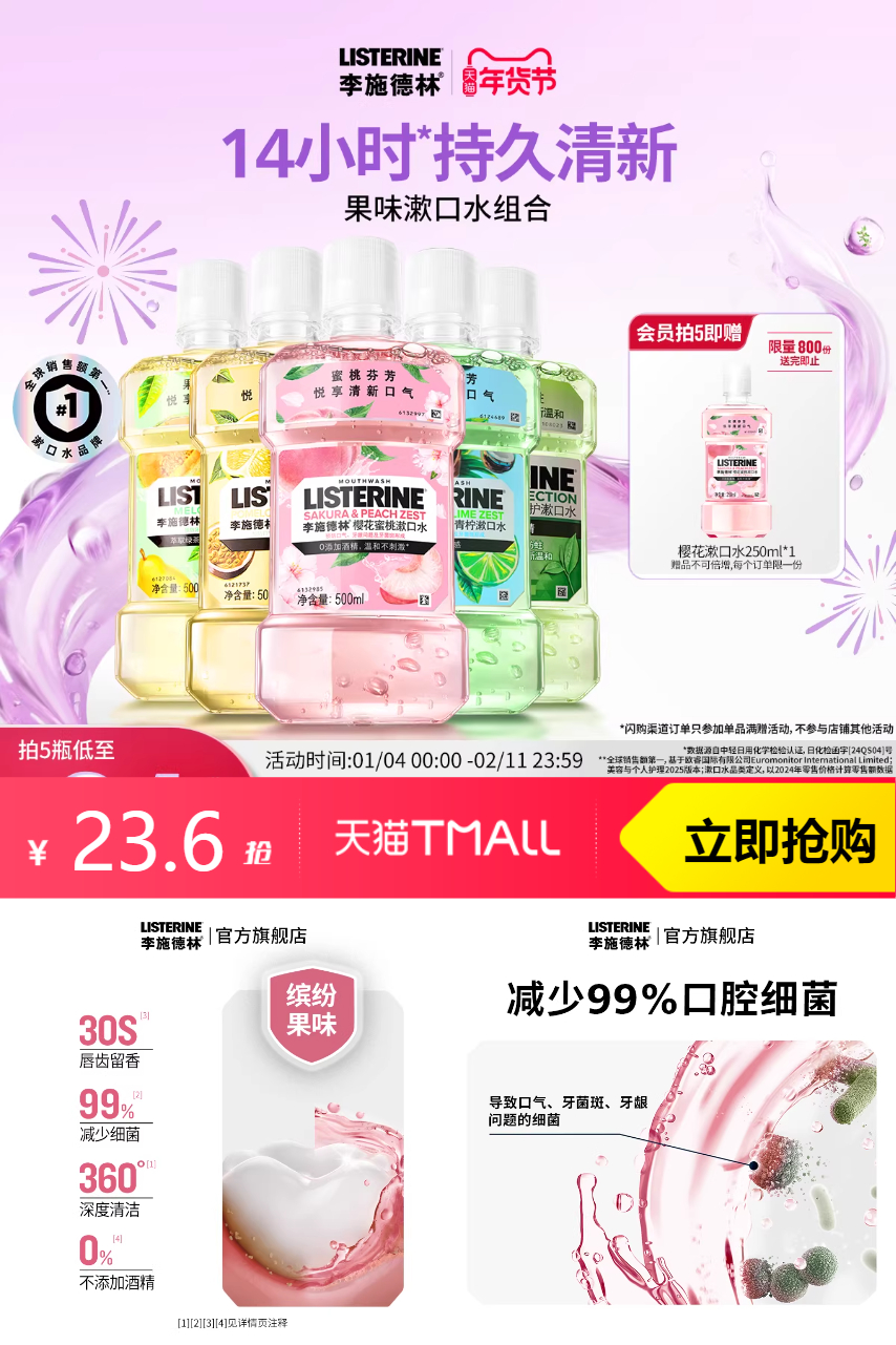 【消费券和淘金币到手20.42】告别口气尴尬,李施德林果味精油漱口水来救场!樱花/柑橘精油配方,果香爆破口腔异味,30秒深层清洁,长效留香超自信。便携条装随身带,出差约会随时清新。