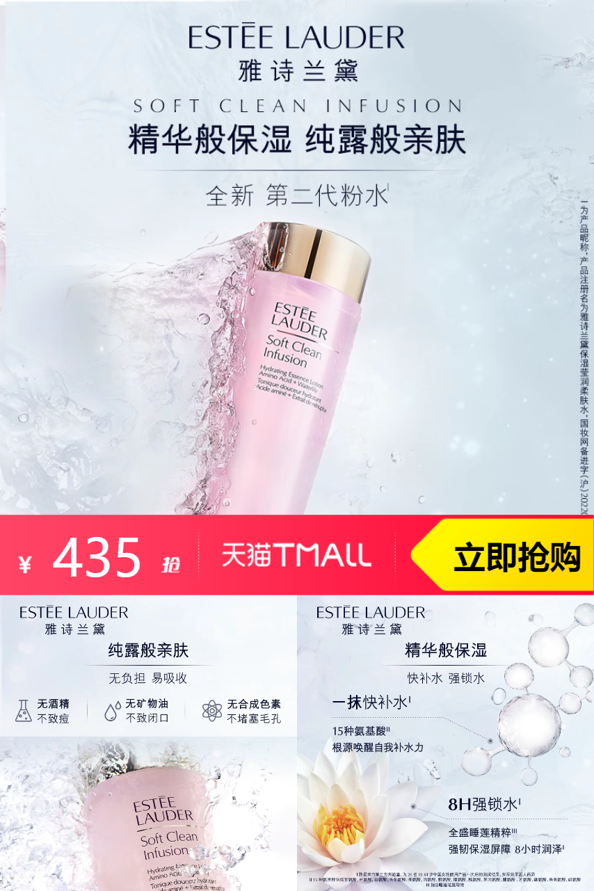 【叠加60消费劵到手435元,叠加美妆劵到手更低,买400ml送同款50ml*5】雅诗兰黛粉水,滋润又清爽,让肌肤焕发光彩,呵护你的每一寸肌肤,轻盈质地,保湿加倍!