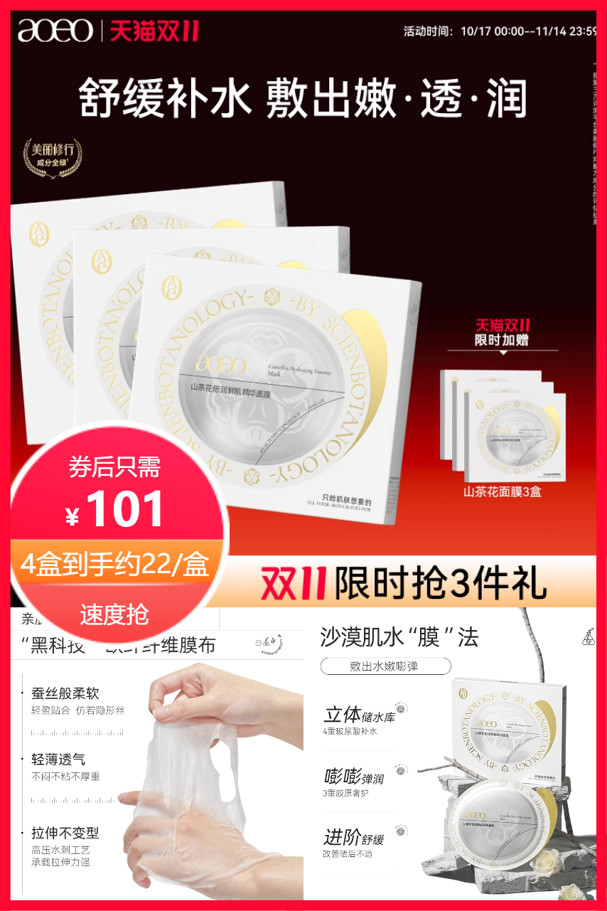 【首单+淘金币4盒到手约22元/盒】AOEO山茶花面膜,倍润精华 + 山茶花精粹!!高效保湿,舒缓干燥!!抗皱紧致,肌肤弹润!!透明质酸钠 + 胶原蛋白,锁水保湿!!官方正品,会员加赠!