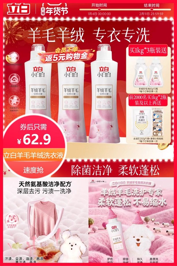 拍第二个选项,官方立减9.3元+券5元+下拉详情淘金币省1元+回购礼金4元+88vip省3.15元后约54.75元,赠送运费险,立白集团官方旗舰店,注入橄榄油精华,羊毛羊绒,柔软蓬松的小心机,天然洁净配方,保持衣物光泽与弹性!易漂洗无残留,除菌除螨99.9