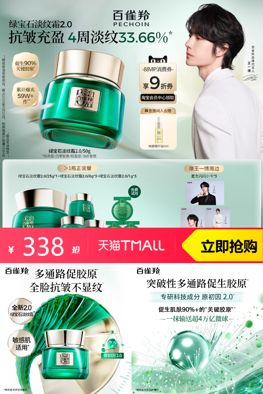 【淘金币减4.45,到手333.55,同享88VIP;买就送同款淡纹霜8g*2+1g*3.】赠品:王一博胶片透卡+百雀羚王一博撕拉折页+王一博镭射卡,绿宝石霜25g*2+绿宝石霜1g*3,高科技萃取植物活性精粹,高浓度包裹透明质酸,1小时有效淡纹,淡化岁月痕迹!