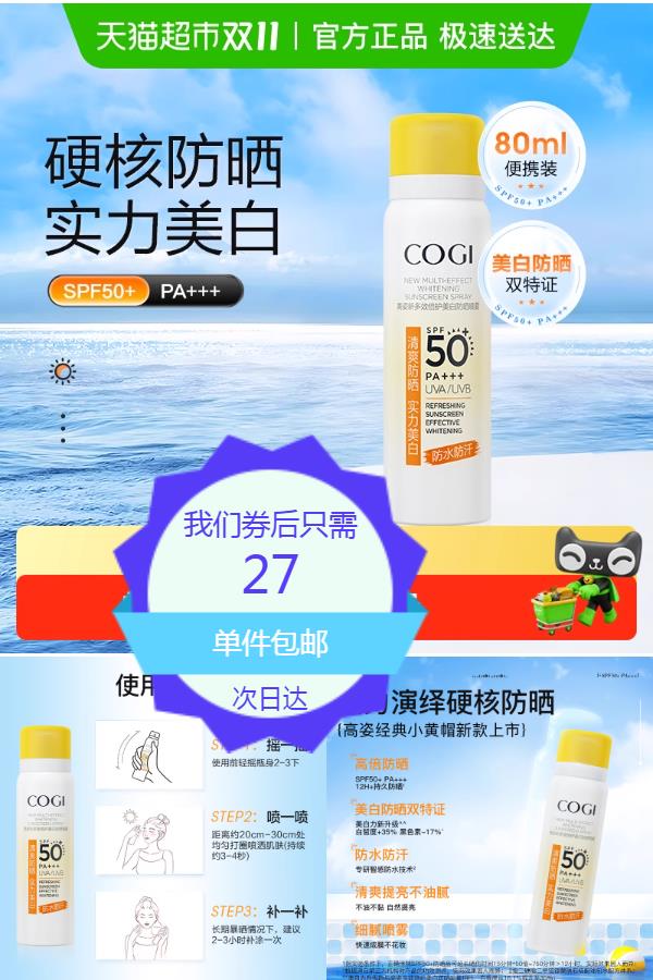 【官方立减42元,领10元优惠券,享美食百货购物券3元,可抵用淘金币,88VIP叠加无门槛9折消费券到手约20元】高倍防晒,防水防汗,喷雾细腻快速成膜,清爽提亮不油腻!美白防晒双特证!【单件包邮,次日达】