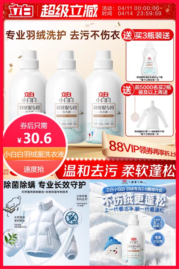 前5千名买2瓶及以上送羽绒服拍打器和羽绒服烘干袋,店铺限时折扣2.23元+超级立减6.6元+券5元+下拉详情淘金币抵扣1.3元+回购礼金3元后约25.37元,叠加消费券后22.1元,立白小白白羽绒服专用洗衣液500g,温和去污不伤衣香氛洗涤剂,柔软蓬松,专业羽绒洗护,买的放心,用的安心