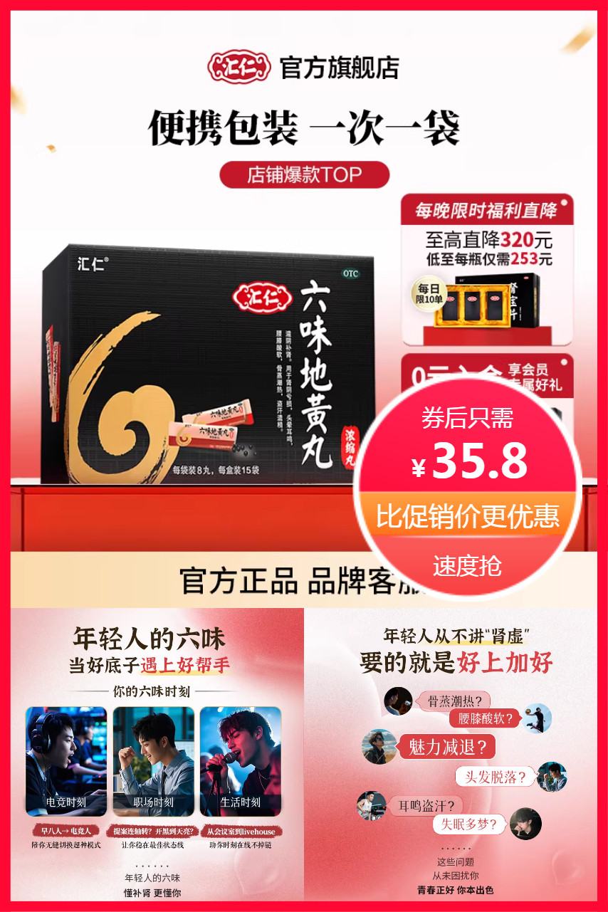 【可签到+官方立减7.2+消费券抵扣到手更优】汇仁六味地黄丸浓缩版,浓缩丸剂型,超微化技术! 快速见效,4倍提速, 滋阴补肾,强肾固体,头晕耳鸣,腰膝酸软,盗汗遗精,缓解疲劳,正品保障,正宗配方不含糖,值得信赖!高性价比之选,补肾优选药材,不再感觉身体被掏空~独立包装携带方便【赠运费险】