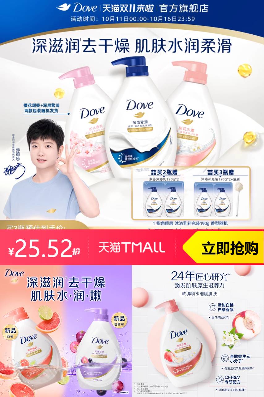 【下拉详情页跳转淘金币,抵扣2.38元,到手价25.52元,买2瓶赠多芬沐浴乳190g*2,买3瓶赠 沐浴补充装190g*2+浴刷】添加多种植萃精油,深层滋养肌肤不假滑,解决浴后干燥掉皮屑烦恼~帮助肌肤生成,牢牢锁住水分~