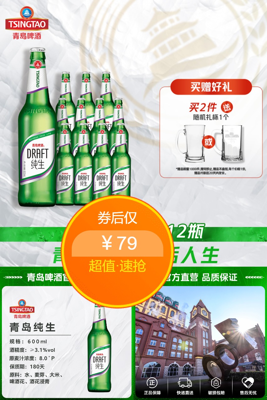 【商d!】88vip后75.05,凑消费券67.54,单瓶到手5.62!买2件送扎杯1个!】青岛啤酒纯生8度,泡沫绵密,采用无菌膜过滤技术,保留了啤酒的营养和麦芽的香味,容量升级至600ml一瓶,好友共同举杯,畅享鲜活体验~