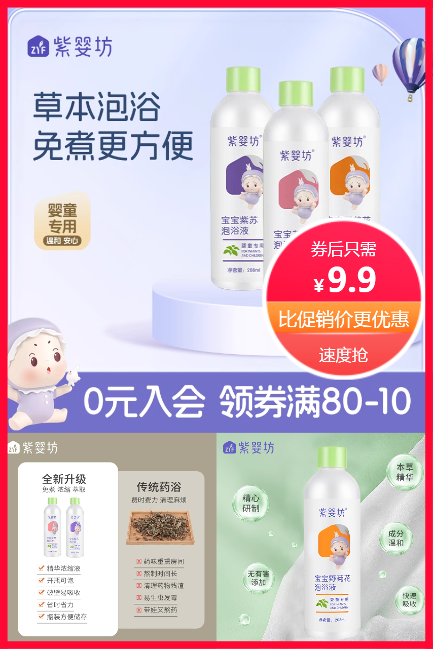 【婴童专用】紫婴坊草本泡浴,开瓶即泡,省时省力,瓶装易储存,易吸收,多种植物草本精华主辅配伍,成分温和,无添加,快速吸收,免煮更方便!安全无毒,四季通用!