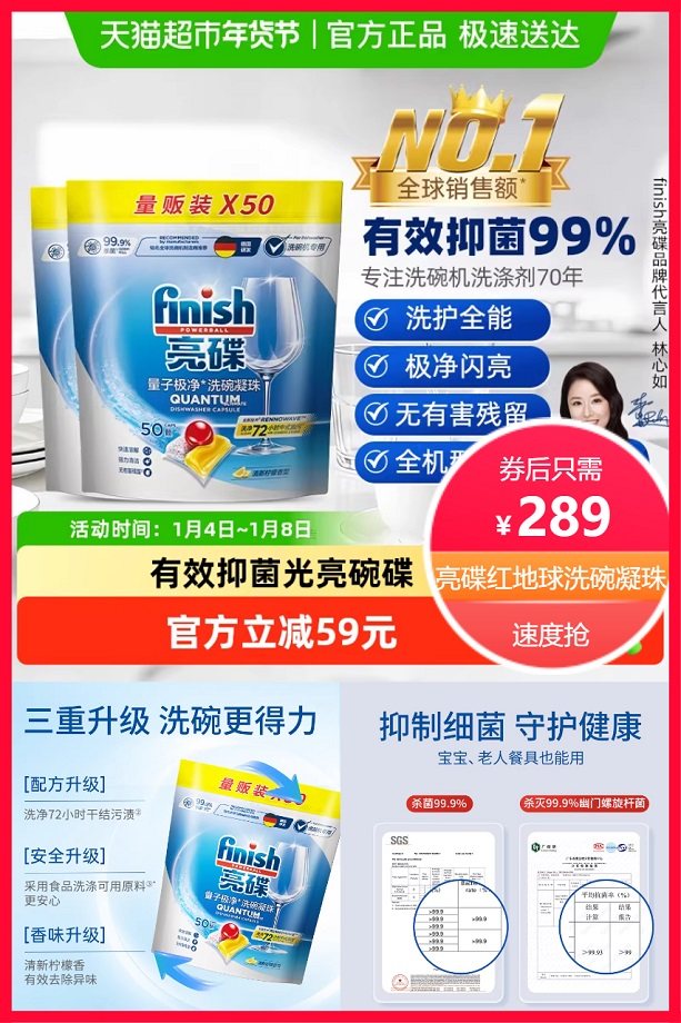超市立减59元+券20元+88vip省14.45元+消费券省25元+淘金币抵扣7.36元后约242.19元,全机型通用,轻松解决顽固污渍,无残留,强力清洁,一颗搞定,宝宝老人餐具都能洗,抑制细菌传播,守护家人健康!安心使用